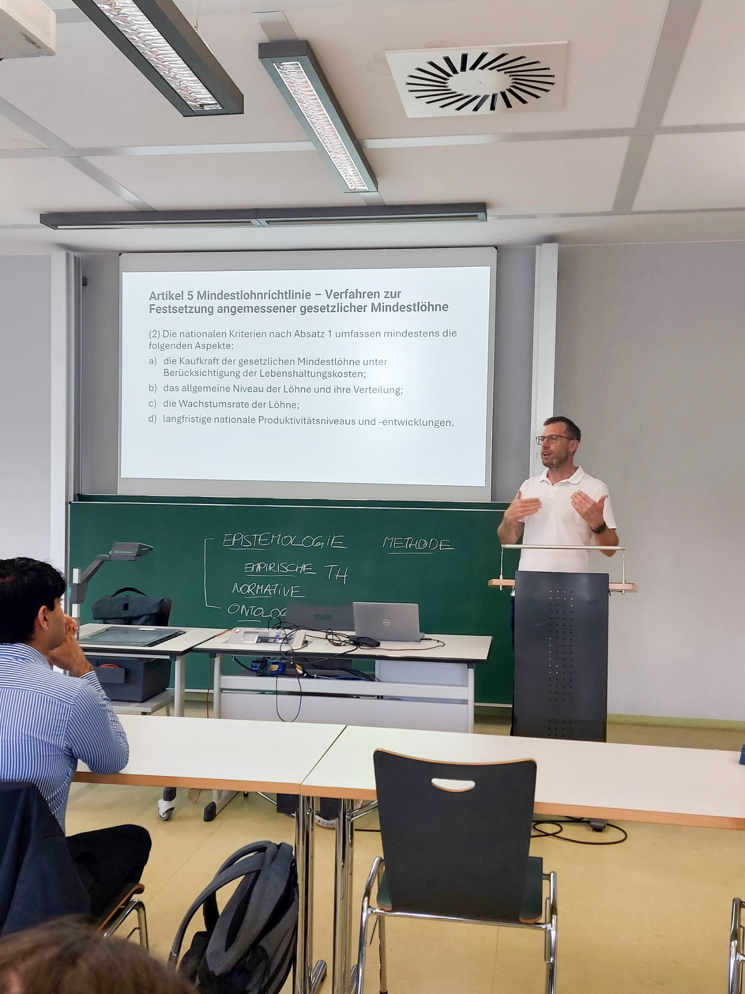 Prof. Dr. Thomas Klein nahm insbesondere zur Umsetzung der Richtlinie und den Problemen der Mindestlohnfindung in Deutschland Stellung. Besonders auffällig sei, dass das Prozedere der deutschen Mindestlohnkommission nicht auf Augenhöhe erfolgt, weil den Gewerkschaften dabei kein Druckmittel zur Verfügung steht. Zudem weise die nationale Umsetzung der Richtlinie erhebliche Defizite auf, deren Behebung durch den aktuellen Koalitionsvertrag nicht in Aussicht stehe.